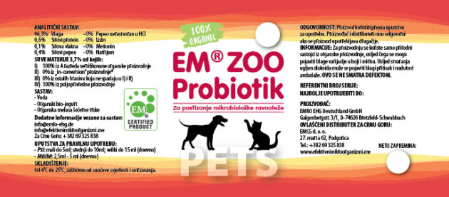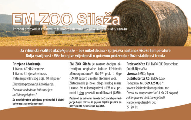 EM ZOO Silaža sadrži inokulante za bolji kvalitet i duže trajanje silaže/sjenaže. • bez mikotoksina • nema povećanja temperature • visok sadržaj hranjivih vrijednosti • duža stabilnost fronta Primjena: 1 litar na 6 tona silažne mase, odnosno 1 litar na 3 tone lucerke i druge mase za sjenažu.